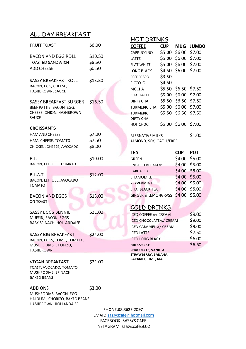 For those seeking a warm beverage, Sassys serves a variety of teas—including Green, English Breakfast, and Chai Black—each at A$4.00. As echoed by satisfied customers like Anne and Mathew, you’ll find fantastic food and a welcoming vibe that make every visit worthwhile. Whether you're grabbing a quick snack or enjoying a leisurely meal, Sassys Cafe promises to be a delightful stop on your culinary adventure.